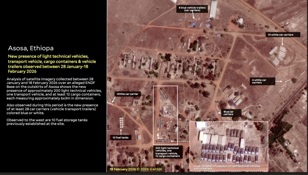 Using satellite imagery and open-source data, the lab reports that the ENDF installation in Asosa Town has been used to support RSF operations across the border into Blue Nile State. The findings, which span a five-month period, include what HRL describes as clear visual indicators of logistical coordination, vehicle transfers, and on-site modifications to military equipment.