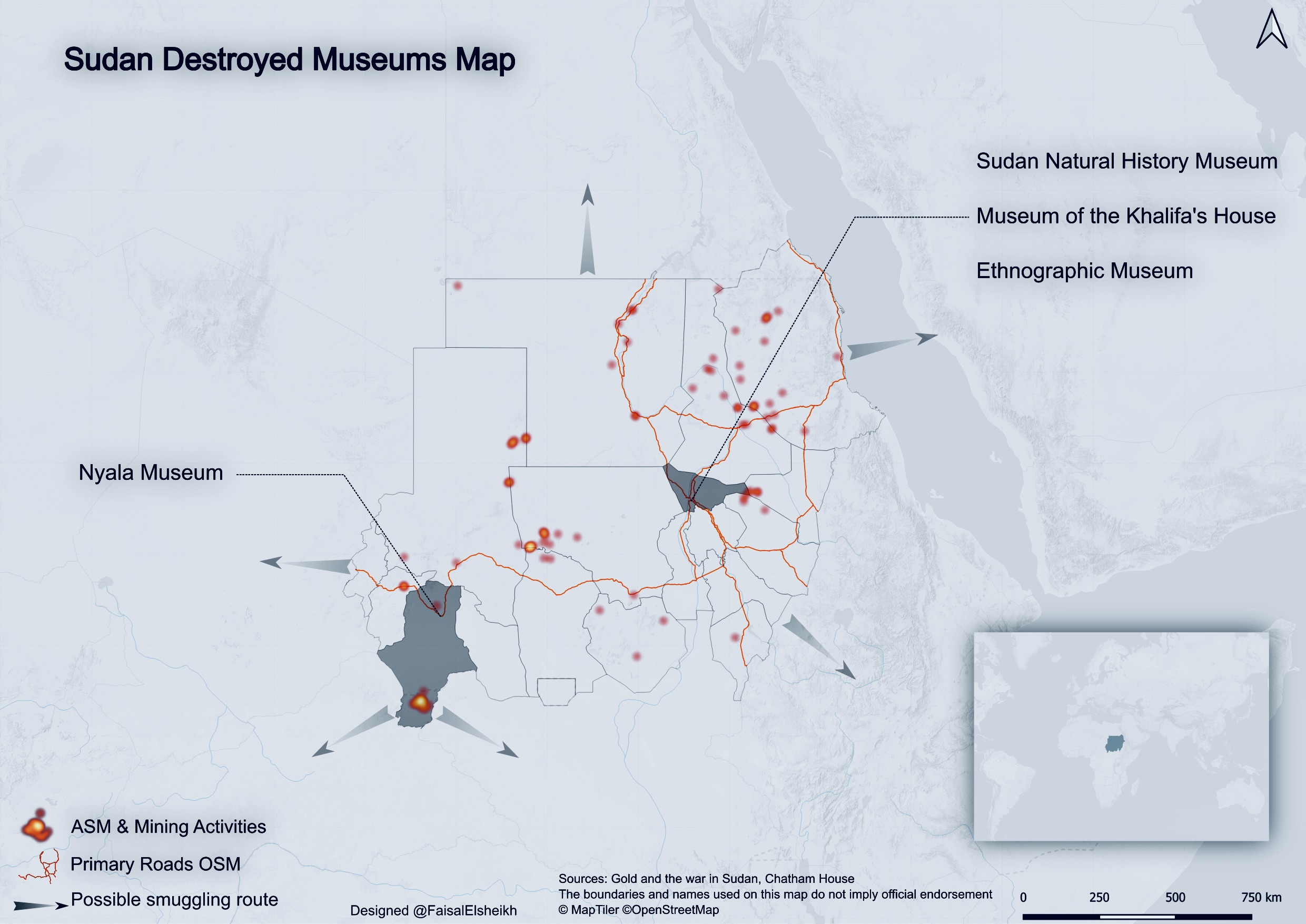على الرغم من استحالة تقديم تقدير دقيق، يقول نور  لـ(عاين): إن “صور الأقمار الصناعية والتوثيق الميداني ساعدتهم في تأكيد أن عشرات المتاحف والمواقع الأثرية ومؤسسات التراث قد تعرضت للتلف أو التدمير، وآلاف القطع الأثرية قد نُهِبَت. وشملت المؤسسات الكبرى المتضررة المتحف القومي السوداني، والمتحف الإثنوغرافي القومي، ومتحف نيالا، ومتحف الجنينة، وبيت الخليفة، بالإضافة إلى العديد من مكتبات الجامعات والمؤسسات الأرشيفية الوطنية”.